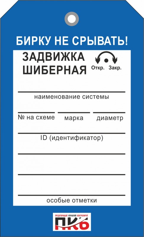 Информационная бирка "Задвижка шиберная". Изготовлена из пластика ПВХ, толщиной 0,3 мм, без ламинации, диаметр отверстия 7 мм. По желанию заказчика толщина бирки может быть увеличена до 1-2 мм. Нанесение текста необходимо производить маркером или шариковой ручкой. Размер 70 х 115 х 0,3 мм.