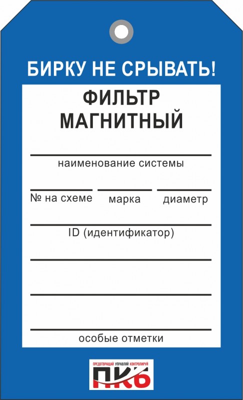 Информационная бирка "Фильтр магнитный". Изготовлена из пластика ПВХ, толщиной 0,3 мм, без ламинации, диаметр отверстия 7 мм. По желанию заказчика толщина бирки может быть увеличена до 1-2 мм. Нанесение текста необходимо производить маркером или шариковой ручкой. Размер 70 х 115 х 0,3 мм.